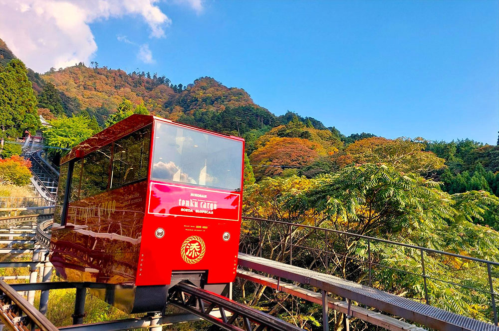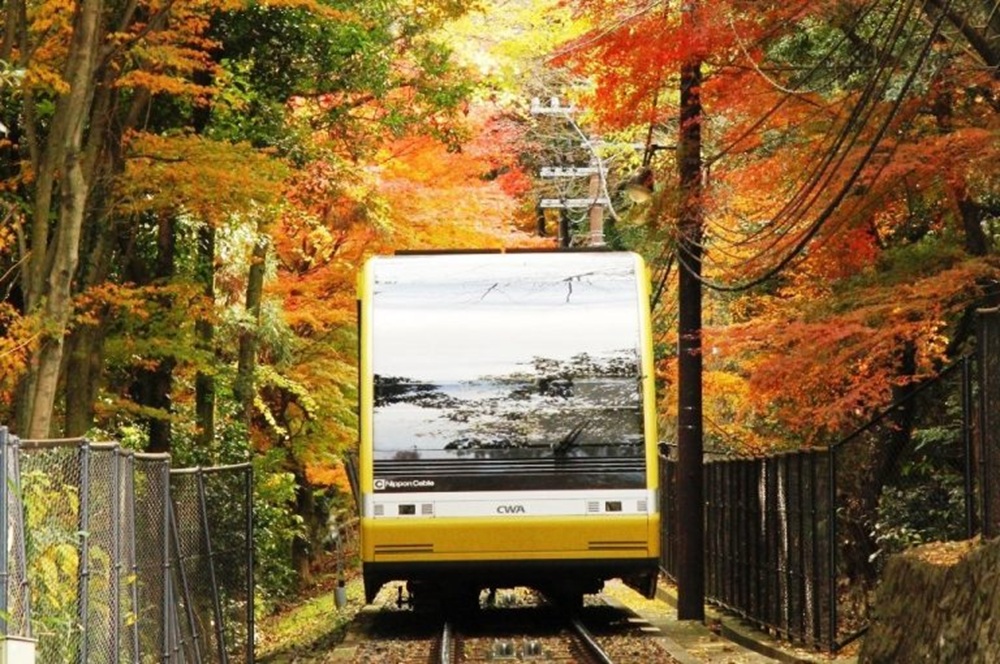 そして紅葉を楽しめるのが全面ガラス張りのケーブルカー。紅葉のモミジ、黄葉のイチョウを車窓から眺めながら登る。実はケーブル全長1,100mと西日本最長級のケーブルカーでもあるのだ。