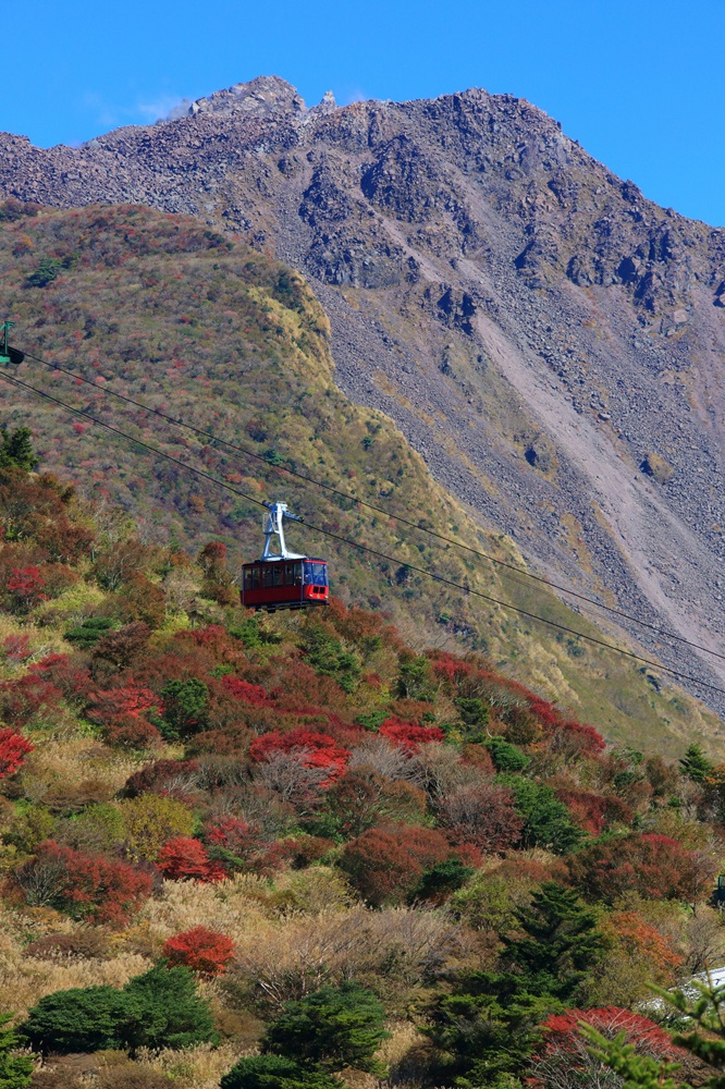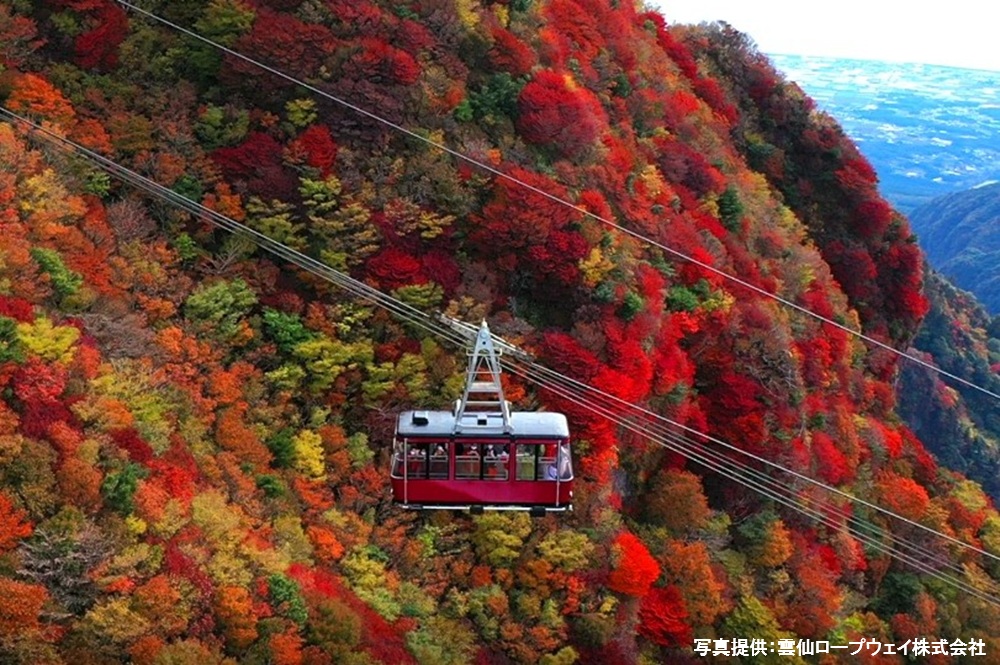 その美しい紅葉景色を空中遊覧で楽しめるのが雲仙ロープウェイ。標高約1,040mの仁田峠駅から標高1,333mの妙見岳駅までを結ぶ。時間にして3分ほどだが、その間たっぷりと見渡す限りの紅葉を目にすることができる。