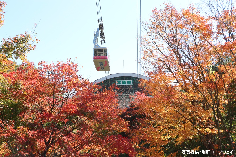 そして鶴見岳山上は10月中旬からウリハダカエデやコハウチワカエデ、山桜などの紅葉が始まり、11月下旬にかけて山麓へと広がる。赤く染まった山と別府湾の青い海を見ながらの空中散歩が楽しい。