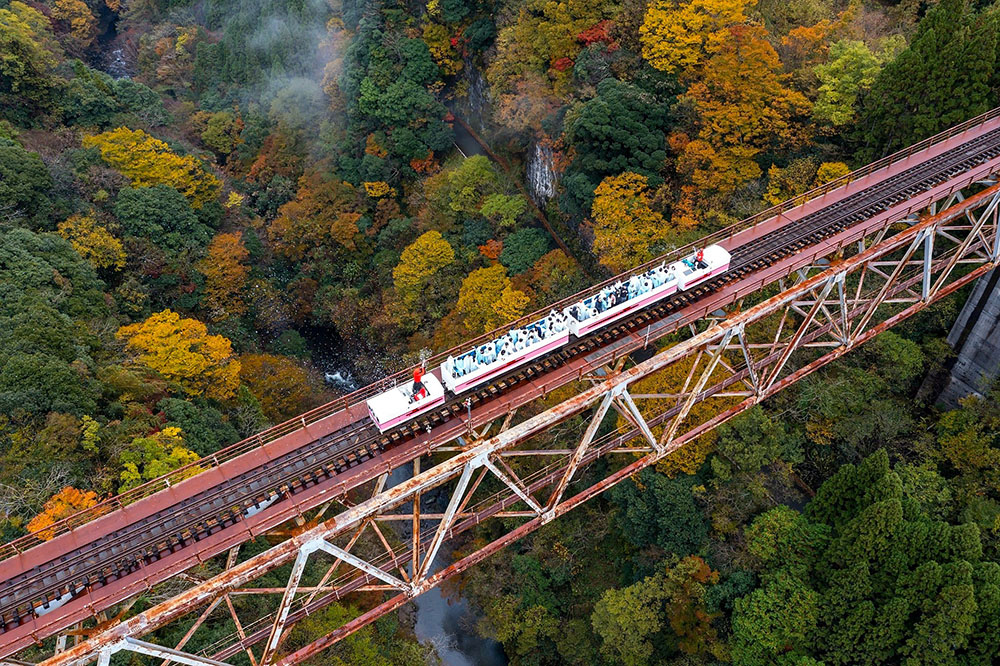 この鉄橋は白川の川からレール面まで高さ約60mとかつては旧国鉄最大の高さを誇った。南阿蘇鉄道の最大の魅力ポイントで、速度もここで落としてゆっくり走る。眼下に谷底と川、そして60度パノラマの紅葉風景。阿蘇の風を思い切り深呼吸しながら、車窓からの風景を楽しんでほしい。(※乗車3日前までにネット予約を)