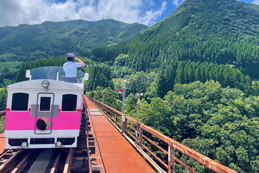ハイライトは日本一の高さの鉄道橋「高千穂鉄橋」。全長353m、高さ105mの鉄橋で一時停止して、シャボン玉を吹いてくれるサービスが人気。