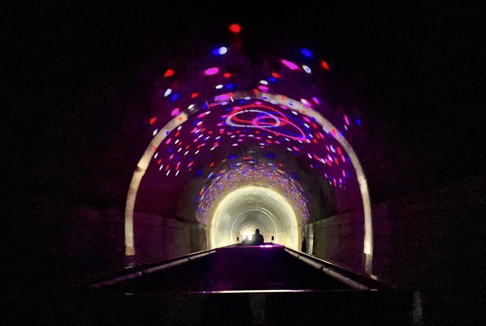 そして晩秋は大峡谷の美しい紅葉景色が加わる。オープントップの車両だけに爽快感もひとしお。シャボン玉が渓谷の上を飛んでいき、はかなく消える。それがまた、いい。トンネル天井のカラフルなイルミネーションが幻想的で、それもまた、いい。