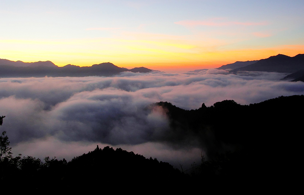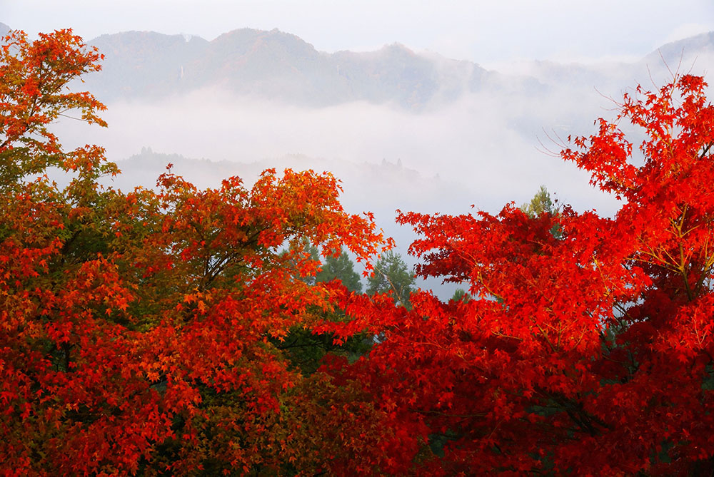 紅葉シーズンとも重なる10月上旬~11月下旬ごろの早朝は、天候などの条件次第で雲海が出る。そのチャンスは年に数回だが、快晴無風の気温が急激に下がった日がねらい目。白い雲海がたなびく様子はまさに天空に立った気分だ。