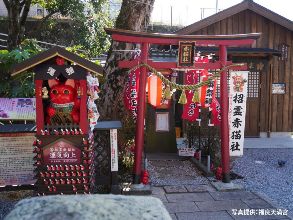 そんな神社の中で今注目を集めているのが「招霊赤猫社(おがたまあかねこしゃ)」です。名前の通り赤猫を祀った神社で、赤猫の御朱印帳や絵馬がかわいいと話題沸騰中。「あかねこ」とは、商売熱心だったかつての臼杵商人を指した言葉で、その中でも特に活躍した大塚幸兵衛という人物の魂を赤猫に込めて建てられたのが、今の社殿です。鳥居や祠、お守りなどの縁起物までどれも赤一色の猫尽くし!運気向上や商売繁盛などさまざまなご利益をもらえるんだとか。可愛さと運気上昇、どちらも求める人にうってつけの初詣スポットです。