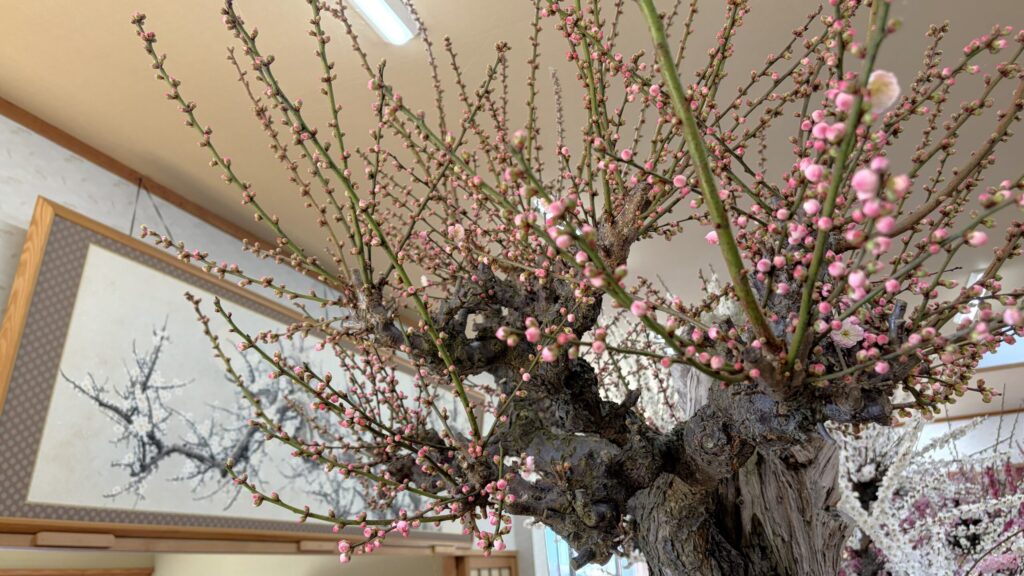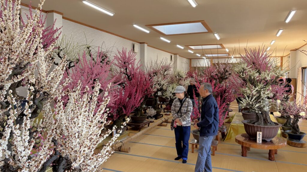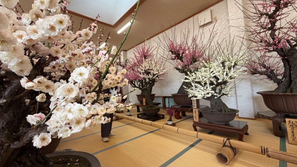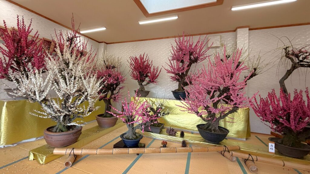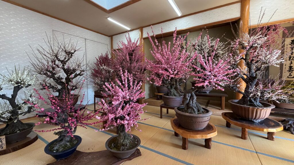 「梅のお花見」といえば、公園や庭園を歩きながら眺めるのが一般的ですよね。でも、ここ「梅花園」のスタイルは違います。広々とした百畳敷の和室の中に、大小さまざまな梅の盆栽が所狭しと並べられている屋内型の観梅です。