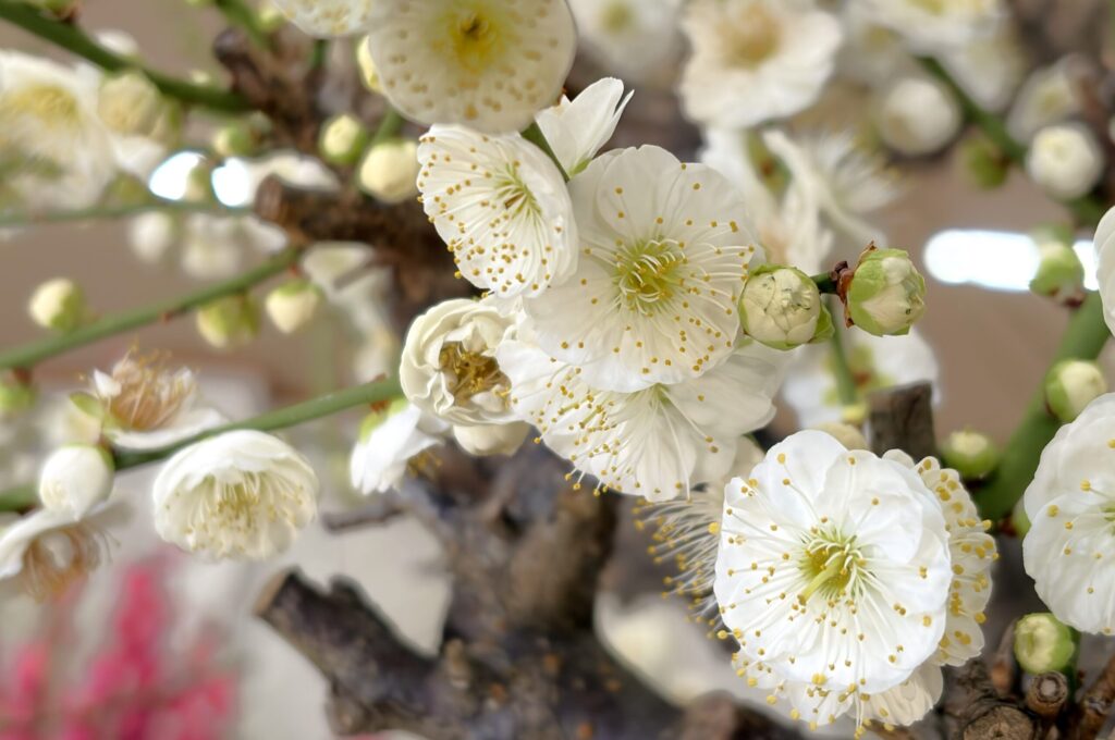 清純な白梅に鮮やかな紅梅、可憐な薄ピンク