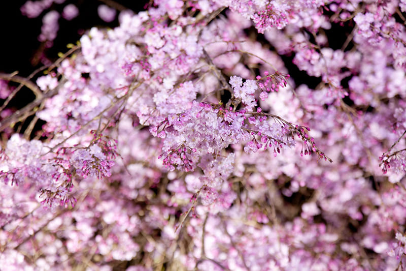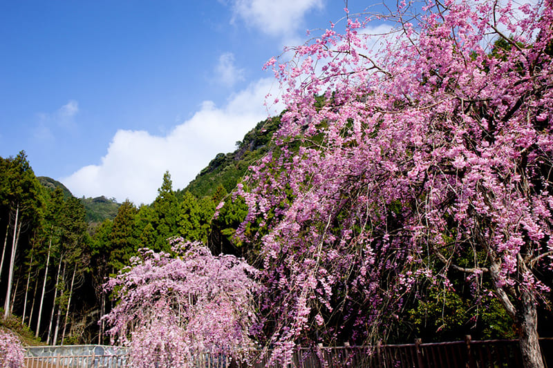 さらに町の中心地から川を渡って古川岳麓の「真竹谷」へ。真竹広場には11品種約60本の枝垂れ桜が植えられ、長崎県一とも言われている枝垂れ桜名所だ。実はこれだけの品種の枝垂れ桜が一つの場所に集まっているのは全国的にも珍しいのだとか。3月下旬から4月下旬にかけて、やや濃いめのピンクの枝垂れ桜が青空を背景に咲き誇る。