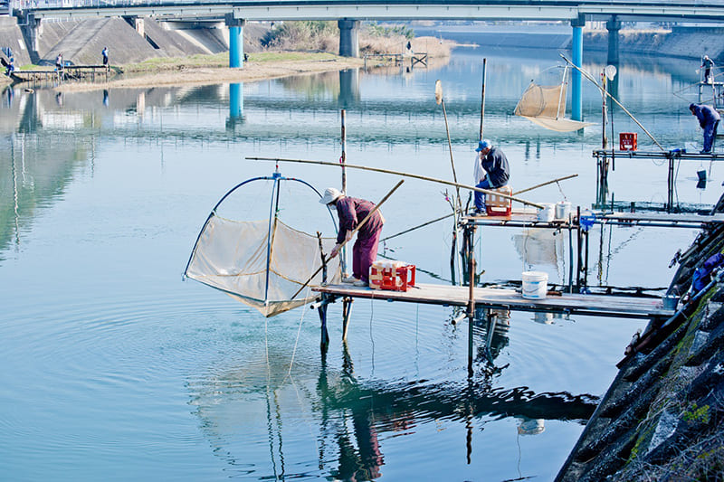 佐々町の名物はシロウオ(素魚)。2月中旬から3月中旬にかけて、佐々川ではシロウオ漁が行われる。シロウオはハゼ科の魚で体長は5センチほど。頭部が丸く、透き通るような体をしており、この時期に産卵のために川に遡上する。それを伝統的な四つ手網の仕掛けで捕獲するのだ。その風景がこの時期に川沿いで見られ、佐々町の早春の風物詩になっている。