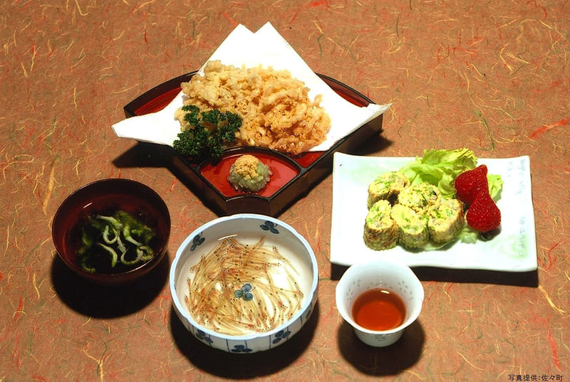 さて、捕獲されたシロウオは生きたまま鮮魚店などへ。生きたままのシロウオをポン酢などで食べる「踊り食い」は、早春の味覚として親しまれている。実はこの踊り食いこそシロウオ料理の代表で、実はシラウオは生食できない。佐々町にはこのシラウオの料理を提供する飲食店が3軒ほどあり、日本料理の「和香園」では踊り食いをはじめ、吸い物、かき揚げ、卵焼きで味わえる。まずはピチピチ飛び跳ねるシロウオを堪能しよう。